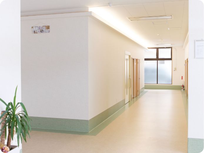 事業所内に広い廊下が通っており、安心して移動できます。歩行訓練などにも適しています。