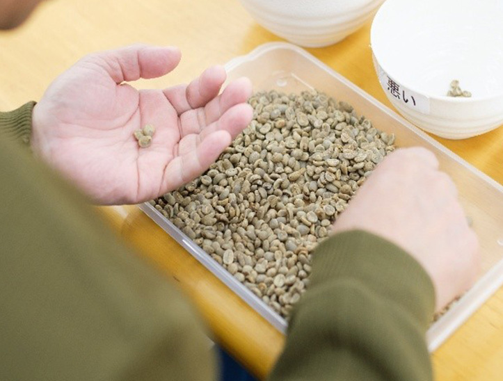 生豆の選別作業です。一つ一つ人の目で選別しています。